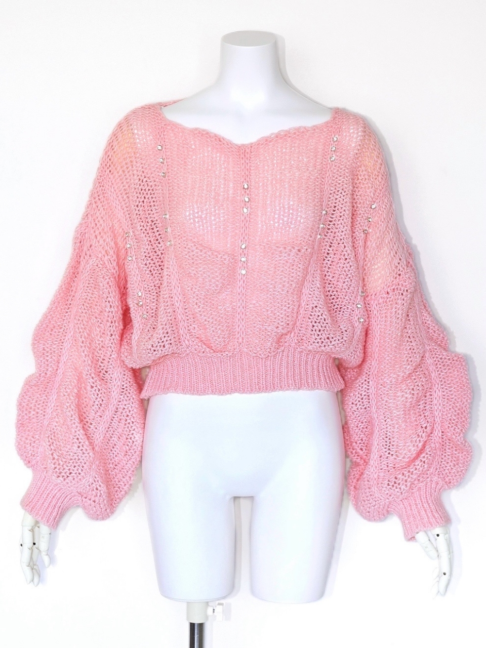ふわふわ柔らかい透かし編みに、ビジューの煌めきを散りばめたデザインが、たまらなく可愛いニットトップス♡ 動くたびにビジューがキラリと輝いて華やかです♡